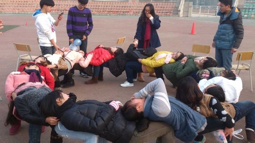 最后便是我们本次组织生活最精彩的“团结板凳”游戏。游戏要求参与者坐在围成一圈的圆形板凳上,一个压在一个身上,在最后所有人都互相依靠时,我们便撤去下方的板凳,由每个人互相支撑,仍保持原来的圆形坚持一定时间。起初,大家都不相信在没有板凳的支持下还能互相支撑起一个圆而不倒下,在几个同学做了示范后,全班被分为男生组和女生组。男生首先围坐在一起,迅速互相压倒在后面同学的身上,女生把板凳撤去之后,男生齐声给自己加油。在坚持了一分钟后有些男生已经有些吃不消,腿开始发抖,有的同学额头上还渗出了汗珠,可是没有人倒下,因为大家心里知道如果有一个人倒下了整个圆就要撑不住了。“加油”的呐喊声更加响亮,女生激动给每个男生鼓掌打气,最后,在全班男生的共同努力下,大家竟然坚持了两分半的好成绩。女生组也不甘示弱,马步扎稳,士气高涨,也坚持了一分半钟。游戏结束后,团支书对大家说:“进行这个游戏,就是想让大家明白,我们班也像这个大圆一样,如果有一个人坚持不住了,整个集体都会受影响。每一个人都很重要,只有我们彼此信任,互相合作,我们的集体才会有成就!”。