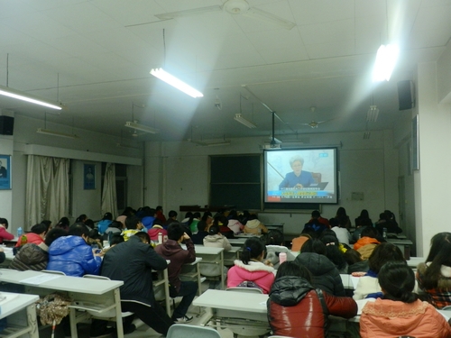 3月5日晚,我院在北校区8507教室组织学生观看了“两会”相关视频。一段关于全国政协十二届二次会议的开幕式的视频当主持人提到为“为昆明默哀时”,学生们纷纷低下头,沉思两分钟,以这种特殊的方式表达对逝者的哀悼。视频观看结束后大家分别就自己关注的话题表达了自己的看法。