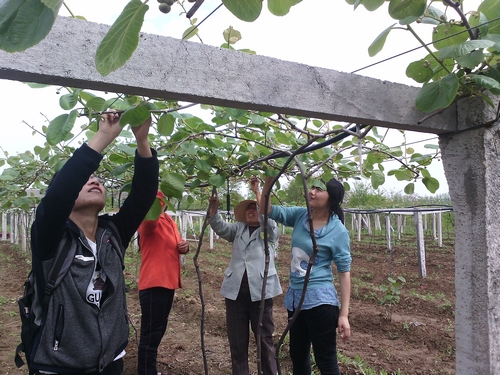“五一”,当别的同学们纷纷走出校园,走进美丽的旅游胜地时,对接杨凌昌兴果蔬合作社的同学们则坚定地奔赴蒋家寨,进行第二次实践劳作。从下午2点到5点,队员们在露天猕猴桃基地进行必要的猕猴桃疏果工作,这个季节正是猕猴桃开花结果的时节,猕猴桃着果率高,若不疏花疏果,往往导致果实小,品质差,造成大小年结果。要想丰产、稳产、优质,必须进行疏花疏果。田园使者们在合作社的负责人魏阿姨的指导下,按照一个叶腋三个果实,应当留顶果,疏侧果。在一个结果枝上疏基部的果,留中、上部的果,短果枝留1~2个果,中果枝留2~3个果,长果枝留3~5果的操作原则认真地劳作起来。经过将近三个小时的实地操作,不仅让队员们扩充了理论知识,而且还让队员们学习了如何更好地与他人沟通能力,锻炼和磨砺自己的意志力和耐心。