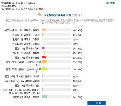 此次班徽设计比赛本着“公平、公正、公开”的原则。分为网络投票、现场投票和答辩三个环节。前期,学院收集班徽作品通过微博、人人网等展示并投票。现场投票环节在西区雕塑旁举行,场面十分热闹,过往的学生纷纷为喜爱的班徽投上宝贵的一票。答辩阶段,班徽设计者一一上台,从设计理念、图标寓意、深层含义等方面阐述了自己的作品。园艺133班张岚清同学的设计灵感则来自于入学教育时王鸣教授报告会上对于园艺科学的解释,设计了以“art”和“science”为母体的班徽,形象而生动,引得了同学的广泛好评。设施132班马辰运同学设计的班徽呈现出“龙凤呈祥”的效果,寓意班级男女生紧密团结在一起,共同书写班级辉煌,使大家眼前一亮。