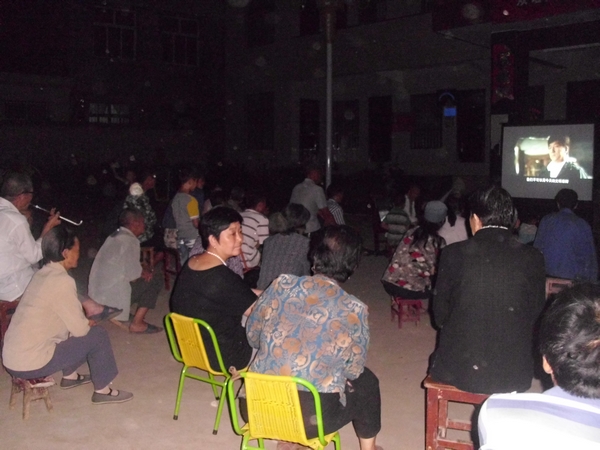 当天晚上,吃完饭稍事休息后,队员们前往西寨村为村民播放电影。队员们先在村委会广播上宣传播放电影一事,随后安装好仪器开始为村民播放电影。