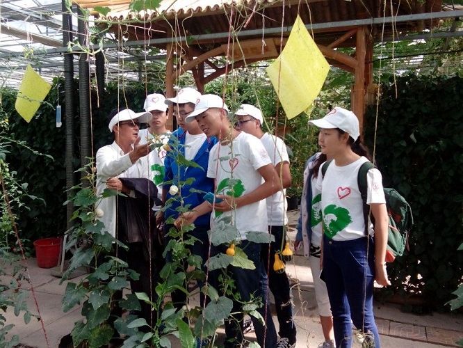 “三下乡”队伍先来到我院设立于“乐都农业示范园区”的社会实践基地,在基地党老师的带领下,参观了育苗室,大棚区,观赏园艺区以及采摘区。在参观途中,党老师悉心讲解,耐心听取并回答了同学们提出的问题,同学们也在基地里了解了他们前所未见的园艺设施以及蔬菜品种,如可以自动调节倾斜角度的大棚,以珍珠岩为主要成分的无土栽培培养基,几百斤重的南瓜……