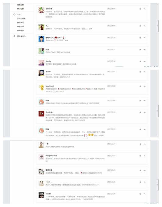 活动过程中,同学们通过申请关注bat365官网登录入口微信官方平台––西农园艺,便可参与活动,表达自己对母校的祝福与支持。学院也为积极参与的同学送上了礼物––校庆晚会入场券。“是您给了我知识的蓓蕾,让我看到太阳升起在东方,是您赋予我前进的动力,让我迈出了人生的第一步,是您用光彩夺目的英姿,让我重新认识了自己,是您孕育了代代莘莘学子,培育了万千教育精英。祝福校庆80年!”是新生对自己人生新舞台的赞美与期许;“沧桑的三号楼依旧活跃着年轻的身影,我身在其中仰望它的宏伟与庄重。我与你相遇不过一年,就能有幸陪伴你过八十岁的生日,就让我在这个桂花飘香的季节轻轻低吟祝福,西农我爱你。”是老生对母校的怀恋与依眷。学院全体学生积极参与,微信后台消息爆满,那一句句从心底里发出的祝福让所有人感受到了西农学子对于母校的拳拳之情和浓浓之意。