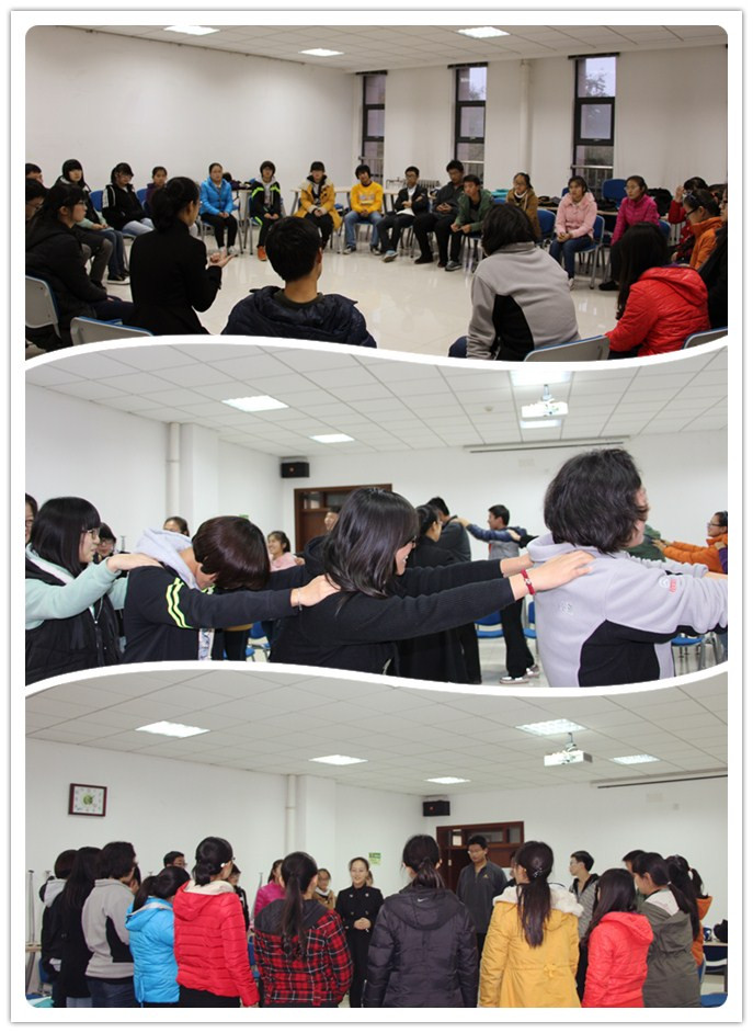 接下来,同学们手拉手成圆圈,然后肆意分散开,在老师下达停的口令后停止走动,找到刚才与自己拉手的人再次牵起手,在不放手的前提下,恢复原来的圆圈。当同学们在挤作一团的队形中对老师的指令深表怀疑时,老师却不断重复“可以的,你们一定可以的”。当同学们发挥集体的力量真正做到时,高兴之余又觉得不可思议。千千之结一解,信念的强大之力已深入同学们心中。大家也都切身体会到:只要整个集体团结一致,所有看似艰巨的困难都是可以克服的,所有的目标都具有强大的可能性!