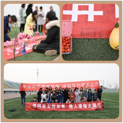除了横幅之外,大家还利用课余时间在田径场体验了缤纷的女生节活动。下午四点半,田径场上男生们逐一完成任务,帮不同的女生完成心愿,比如说买一个鼠标,买一盒草莓,买一个柚子。女生们把自己收到礼物的惊喜,把对男生们的感激写在横幅上。活动中班上男女同学收起了害羞,大胆的表达节日的祝福,彼此之间少了羞怯更像一家人一样融在一起。之后,大家围坐一圈,玩着心有灵犀的游戏增进彼此的了解。田径场上的活动让每一位女生都享受到了一天公主的生活。在班级八位暖男走心的安排中,整体活动完美落幕,班上女生纷纷发出“园艺1503班男神最帅”的赞扬!