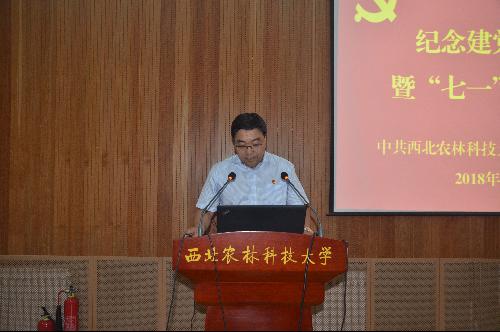 学院党委书记黄德宝代表学院党委向新加入党组织的同志、向受到表彰的先进基层党组织、优秀共产党员、优秀党务工作者表示热烈的祝贺。他简要回顾了党的发展历史和近年来党的建设伟大成就,及合校以来学院的成就,成绩突出,振奋人心。同时也指出了工作中的不足以及下一步改进措施,对学院各位党员提出了殷切期望。并对全体党员提出了三点希望:一是不忘初心,坚定理想信念,师生党员要勇于担当、甘于奉献,时时刻刻不忘自己的党员身份,自觉成为社会主义核心价值观的先行者、实践者、推动者。二是不断加强政治理论学习,保持思想上的与时俱进,自觉贯彻执行新时代新思想;三是牢记服务宗旨,发挥模范带头作用,全体师生要牢固树立“四个意识”,坚定“四个自信”,始终保持共产党员的先进性,立足岗位,主动迎接挑战,为取得双一流建设新成就而继续努力奋斗。