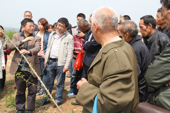 4月20日,西安市果业技术推广中心,灞桥区农林局和农技推广中心等单位组织,果业技术推广中心研究员郭晓成,园艺站站长关俊英等专家带领120余名从事樱桃种植的职业农民来我院铜川果树试验示范站观摩学习樱桃栽培管理技术。