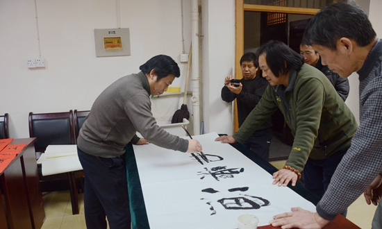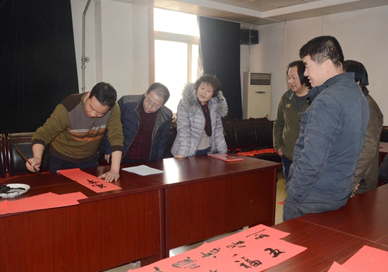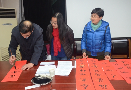 为迎接农历2015年新春佳节的到来,1月22日下午,我院特邀校工会副主席马军涛、李峰,校书法家协会会员高岩、张冰等老师来我院为教职工免费现场书写春联。