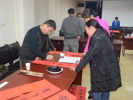 大家纷纷来到现场,选择自已喜欢的对联内容,请书法老师现场挥笔,现场充满了和谐热闹的气氛。