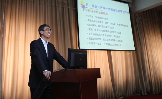 钱永华从改革方案出台的背景、方案的总体目标和基本原则、建立公开统一的国家科技管理平台、新的科技计划(专项、基金等)体系、优化整合工作的具体实施进度等五个方面对新政策做了详细解读。他指出,新的科研管理政策出台后科研工作将面临巨大的机遇和挑战,鼓励学院科教人员尽快了解现行科研体制,熟悉国家科技计划管理改革,拓宽视野,大胆创新,以国家需求为导向,扎实开展科学研究,努力开创学院科研工作的新局面。