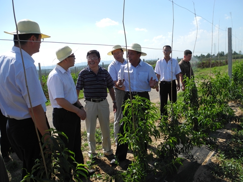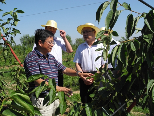 试验站首席专家蔡宇良教授介绍了试验站建设和工作进展情况。国家苹果产业体系李新建专家介绍了苹果大苗栽植与芽苗栽植第二年成效情况、膜下节水滴管技术及自然生草技术。国家桃产业体系西安站站长王安柱教授介绍了桃高光效主干型栽培模式及普通桃、蟠桃、油桃等品种。李志强一行参观了樱桃‘V’字型矮化栽培模式、不定干超细长纺锤形栽培模式及改良‘UFO’栽培模式等,充分肯定不定干超细长纺锤形栽培模式适宜向当地农民进行推广,成型快、易管理;认为合作社可采取苹果大苗栽植模式,提高生产效益;建议选择适宜当地的桃优良品种,在老果园区进行高接换头试验推广。