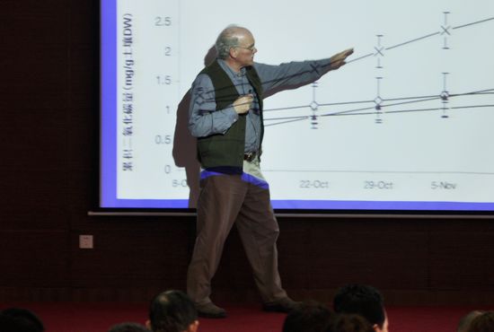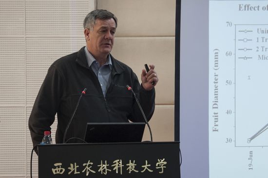 美国康奈尔大学国际食品农业与发展研究所的Christy教授、康奈尔大学园艺系的程来亮教授、美国哈德逊河实验室的Hoying教授、加州大学戴维斯分校的张明华教授、从事水果采后科学研究的Watkins教授、果树应用生理学研究的Robinson教授和农村社区和自然资源可持续利用研究的Merwin教授分别从市场营销介绍、矮化砧苹果树的养分管理、砧木和成苗的培育、苹果树高纺锤形和垂直主干形整形修剪、高密度果园的栽培灌溉、负载量管理以达到最大效益、达到最佳果实品质的采后处理和贮藏、推广应用信息技术提高苹果产量以及果园土壤如何影响中国的苹果果农等多方面为大家就矮砧密植型苹果产业做了细致讲解,并对学员现场提出的问题做了解答。