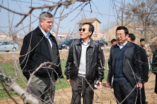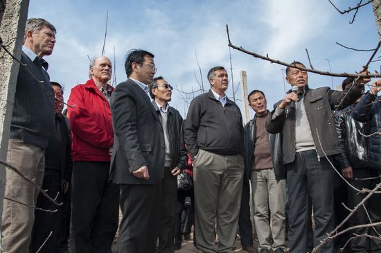 3月9日下午,来自美国康奈尔大学、加州大学戴维斯分校的多名苹果产业专家在我院院长马锋旺教授的陪同下参观了陕西省乾县矮砧密植型苹果生长生产情况,并现场为数百名果农讲解矮砧密植型苹果栽种的相关技术,受到了当地果农的热烈欢迎。讲解结束后,专家组一行还对乾县苹果冷链贮藏企业进行了参观考察。