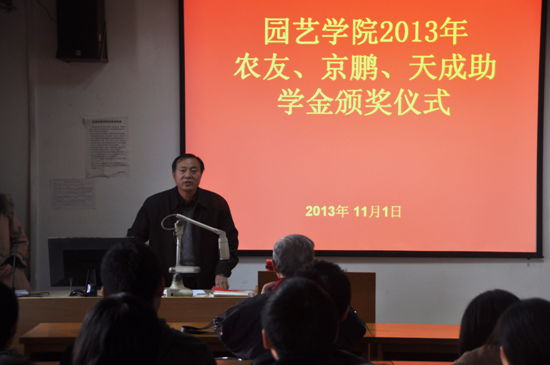 11月1日下午,我院在学院四层东会议室举行了2013年“农友种苗扶贫助学奖学金”、“京鹏助学奖学金”及“天成奖学助学金”的颁奖仪式,蔬菜系教授、慈善明星王鸣老师、学院党委副书记李京春及获奖学生出席了颁奖仪式。