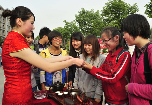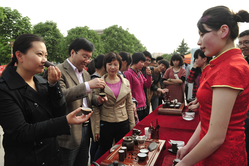 由中国茶叶学会主办的2013年全民饮茶日活动以“茶为国饮,品味生活”为主题,倡导“全民饮茶”。在充满文化气息的大学校园里,通过饮茶日活动,弘扬茶文化,引导广大学生热爱祖国的灿烂文化,继承发扬优秀文化传统,提高学生的文化修养。