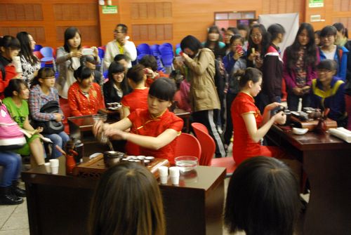 报告会结束后,由bat365官网登录入口茶艺表演队队员在北校区绣山活动中心大厅现场展示茶艺。表演现场,徐徐流出的古乐,女学生优雅的泽水、烹茶演绎,若隐若现的茶香吸引了不少同学前来观赏,连连称赞。