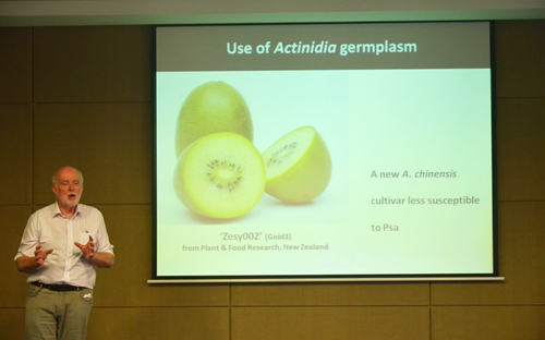 报告会上, Allan Ross Ferguson院士向大家介绍了猕猴桃的生物学特性和人工栽培历史,介绍了新西兰的猕猴桃发展现状,强调了猕猴桃种质资源对于猕猴桃育种的重要性,指出了当今猕猴桃品种种植比较单一,仅“海沃德”品种就占据了全世界70%的种植面积,因此我们还需要大力开展其它品种的选育和推广;Mike Manning博士向大家展示了一种细菌病害“PSA”在全世界的发展以及对新西兰猕猴桃种植的影响,介绍了目前对这种细菌病害的相关研究及相应的应对措施;Jinhu Wu 博士向大家回顾了试管离体生物技术如胚挽救技术、原生质体融合等在果树育种工作中的重要作用,指出了相对于转基因技术,这种技术在安全性和育种实际工作中的优势。